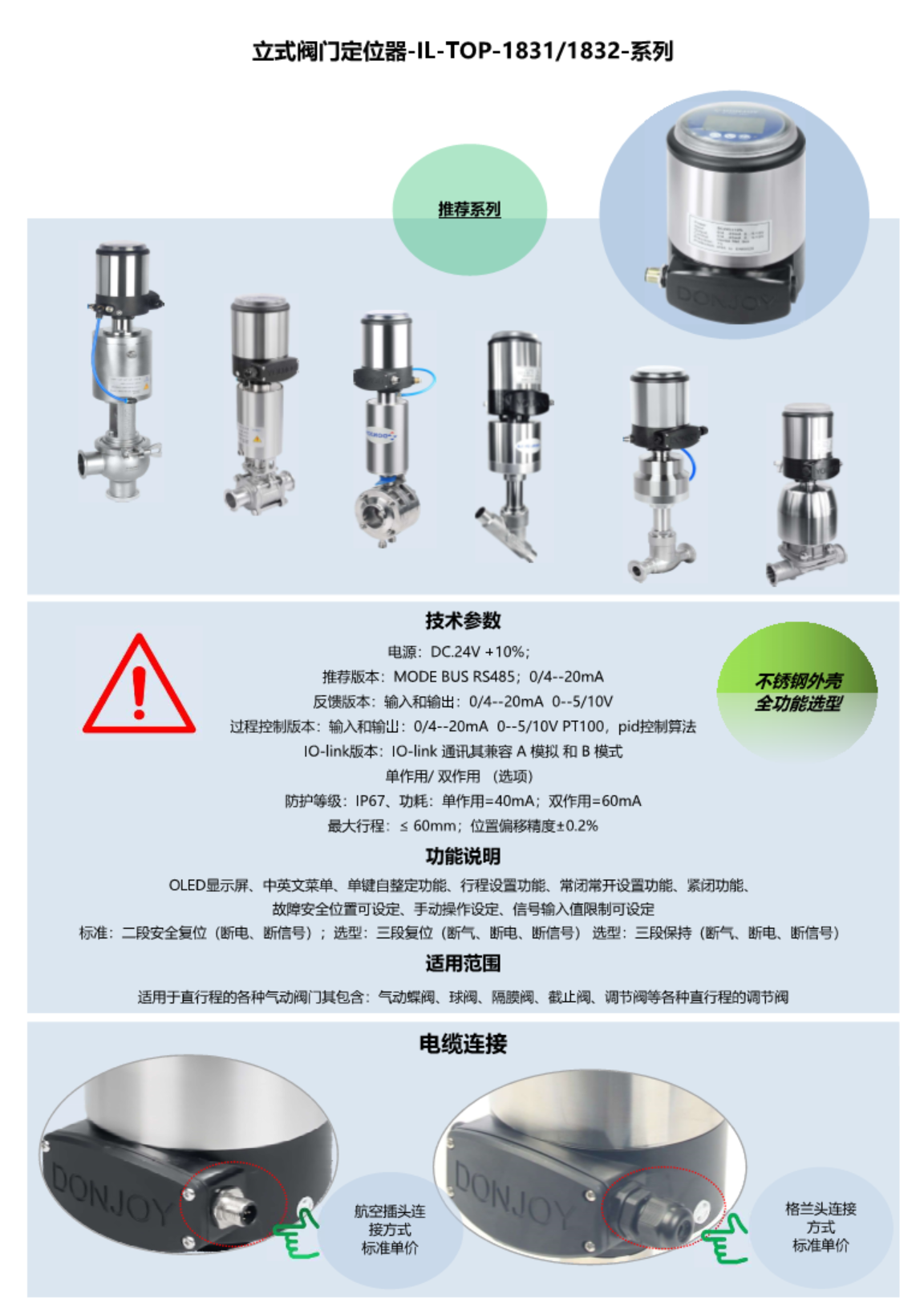 東正IL-TOP-1831型產品是一款直行程氣動閥門定位器,現已全面兼容IO-Link模塊,此產品可安裝到各種氣動閥門上,如不銹鋼氣動蝶閥、隔膜閥、角座閥、截止閥、