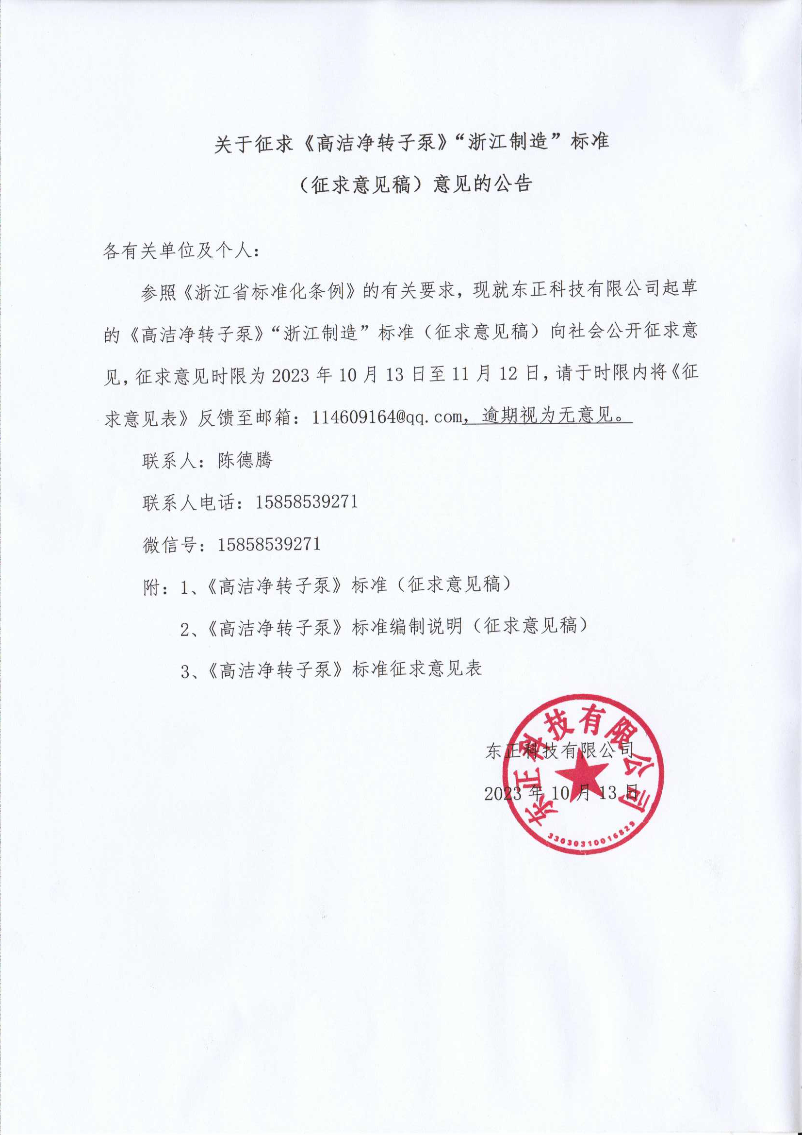 2023年10月11日在東正科技有限公司召開“浙江制造”團體標準會,東正科技有限公司起草了《高潔凈轉子泵》的“浙江制造”標準(征求意見稿),并向社會公開征求意見。