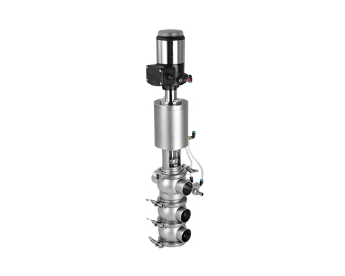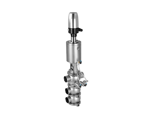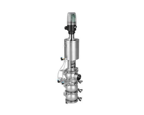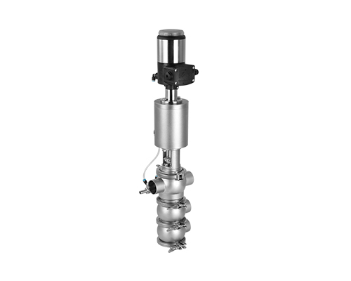 E-C系列防混閥主要由執行機構、連接支架、閥桿、閥體組成,閥桿通過執行器機構驅動做軸向直線運動,閥桿向上運動時,上下管路通道開啟;閥桿向下運動時,通道關閉。閥桿上設計有兩道密封圈與閥體密封面形成獨立的密封腔,與CIP閥相通,可用于密封檢漏;或上下管路流通不同介質時起到防混監測的作用。
