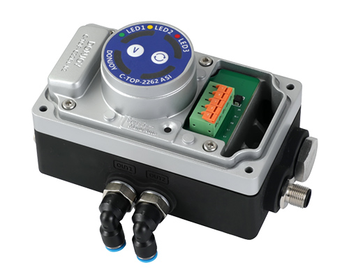 C-TOP-2262是一款本安防爆設(shè)計的閥門控制單元,它接收來自PLC/DCS或其他自控系統(tǒng)指令進(jìn)行工作,同時反饋當(dāng)前閥門位置信號到PLC/DCS等自控系統(tǒng),也可通過IO-Link、AS-I V3.0版本總線通訊。每個位置都會通過不同位置顏色LED燈顯示當(dāng)前狀態(tài)。